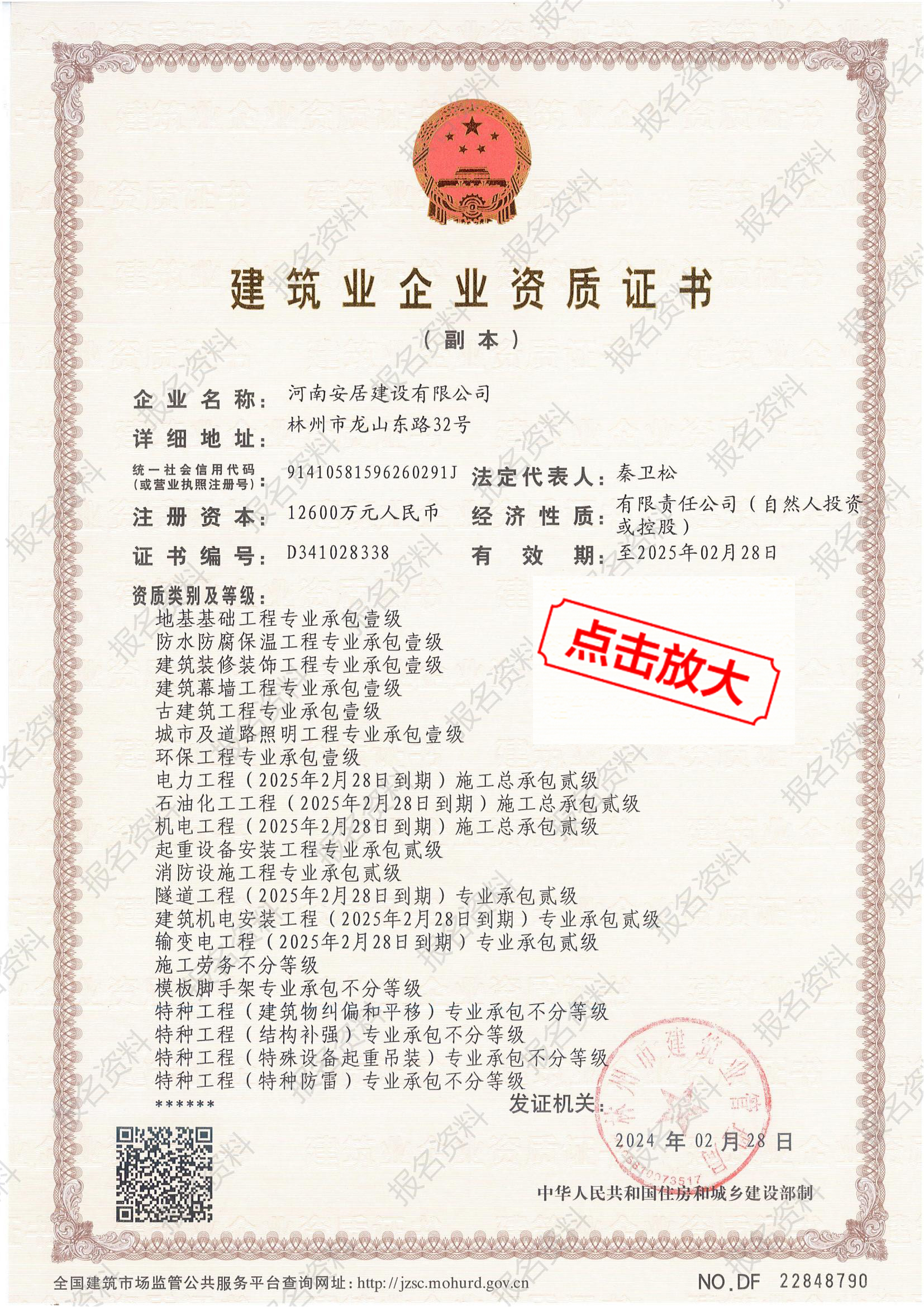 滔滔黃河哺育了中華民族拼搏向上的奮斗精神,巍巍太行造就了中原兒女的紅旗渠精神。百萬林州人下太行,鑄就了中國(guó)建筑之鄉(xiāng)響當(dāng)當(dāng)?shù)囊燮放啤:幽习簿咏ㄔO(shè)有限公司從誕生起血液里就流淌著紅色基因,秉承“安得廣夏千萬間,大庇天下寒士俱歡顏”的擔(dān)當(dāng)精神,用鋼筋混凝土筑起了高樓大廈,也用一流品質(zhì)、家國(guó)情懷打造了安居建設(shè)的輝煌成績(jī)。公司成立于2012年,注冊(cè)資金12600萬元,公司成立至今,擁有建筑,市政施工總承包等十項(xiàng)一級(jí)資質(zhì);其他二級(jí)等資質(zhì)共二十余項(xiàng)。公司秉承質(zhì)量第一,服務(wù)為主,堅(jiān)持垂直管理,從不設(shè)立分公司等分支機(jī)構(gòu)。